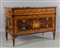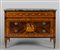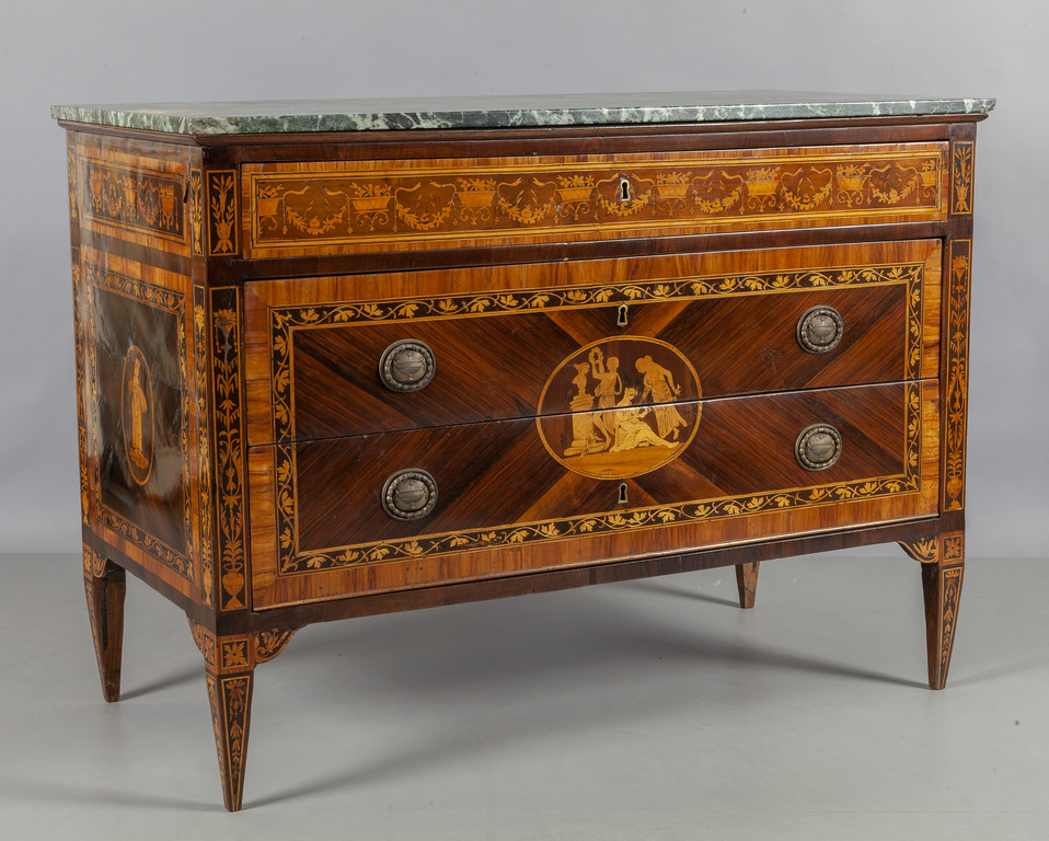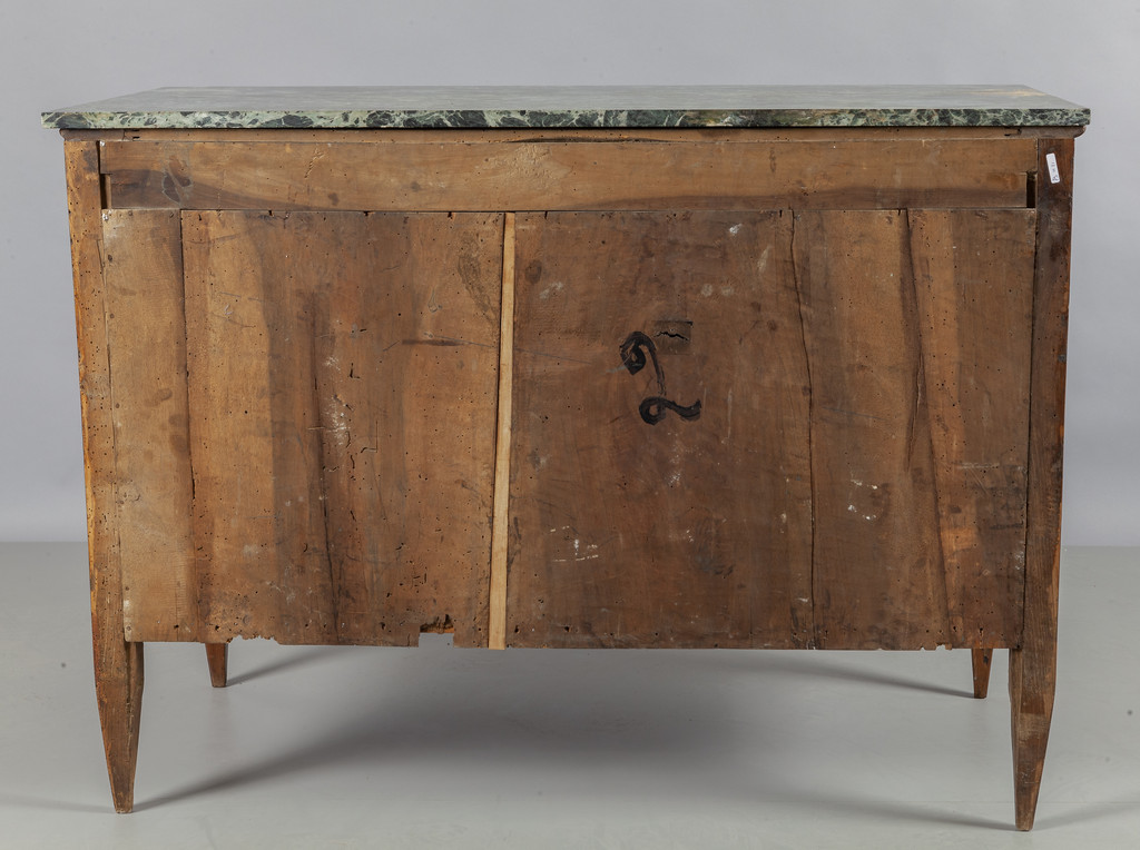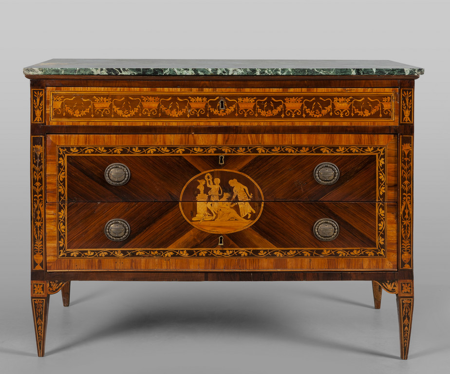 Comò Luigi XVI a due cassetti senza traverse e un cassetto sottopiano lastronato e finemente intarsiato con medaglioni centrali piano in marmo verde Alpi Lombardia II metà sec.XVIII