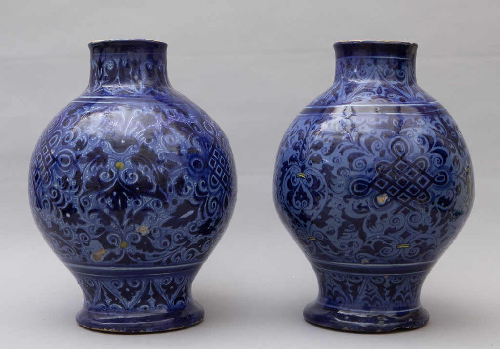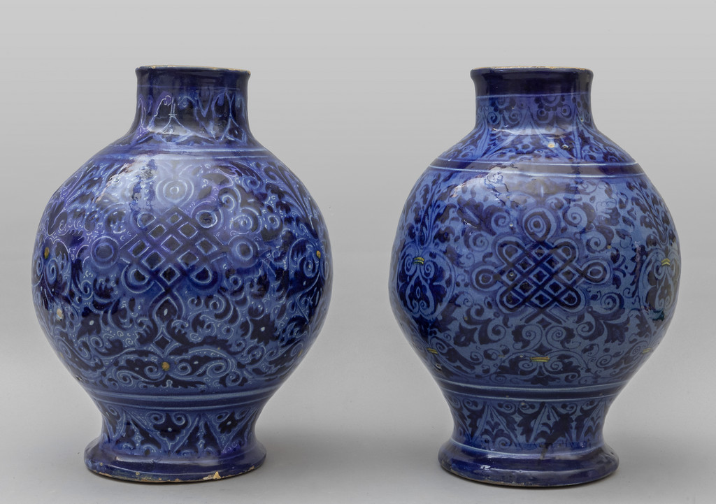 Coppia di grandi bocce in maiolica a fondo blu con decorazioni floreali Venezia sec.XVI