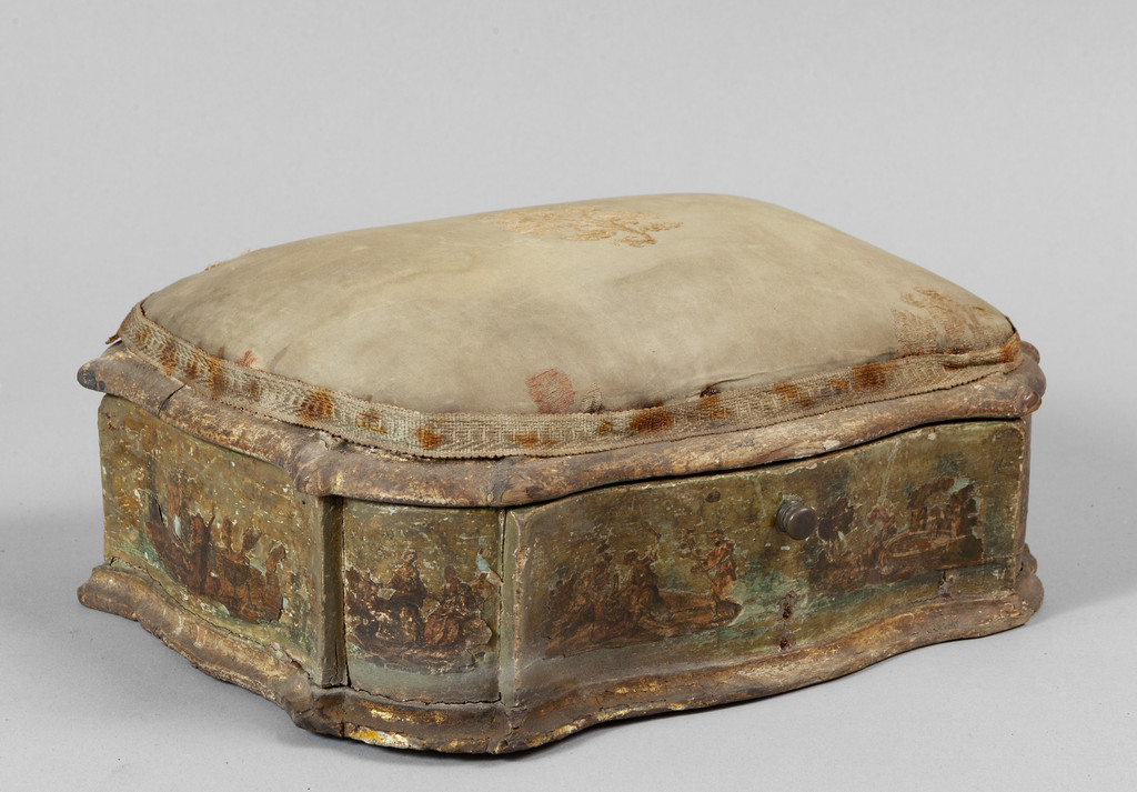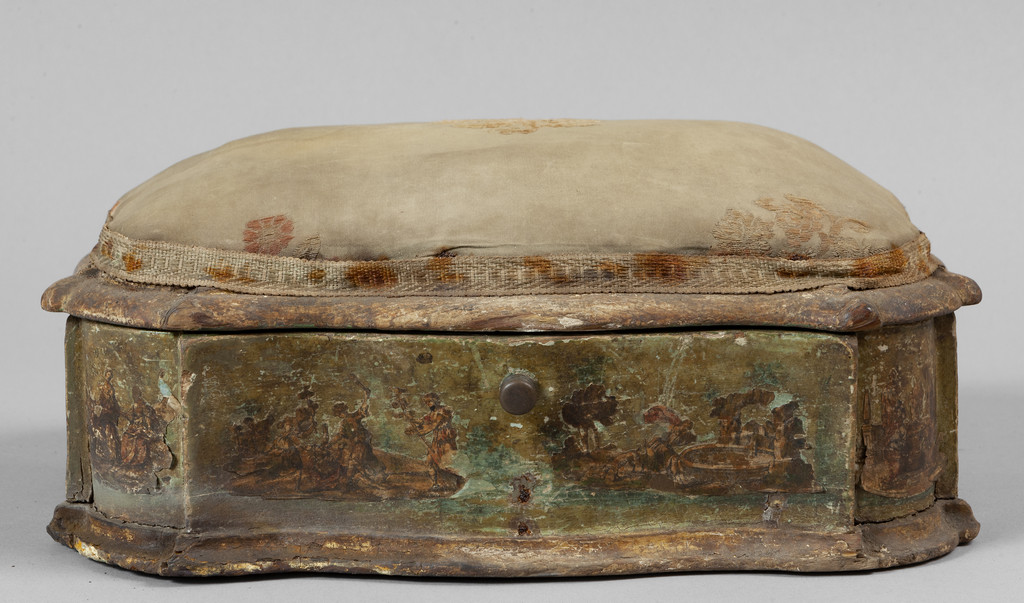 Scatola Luigi XV puntaspilli in legno laccato e decorato in arte povera Venezia sec.XVIII