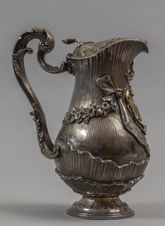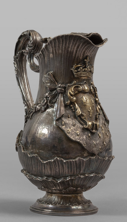Brocca in argento finemente sbalzato nella parte anteriore stemma nobiliare con i gigli di Francia manico in argento Francia fine sec.XVIII inizi sec.XIX
