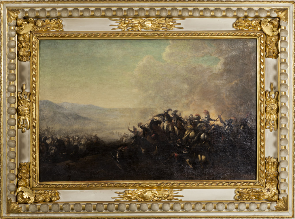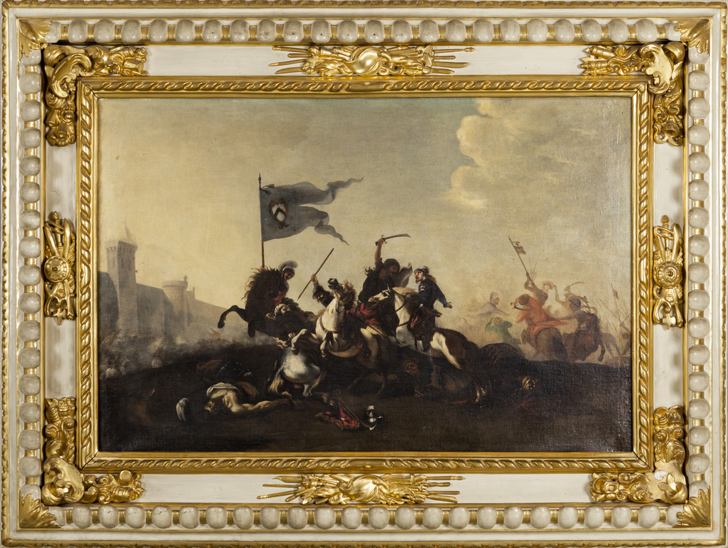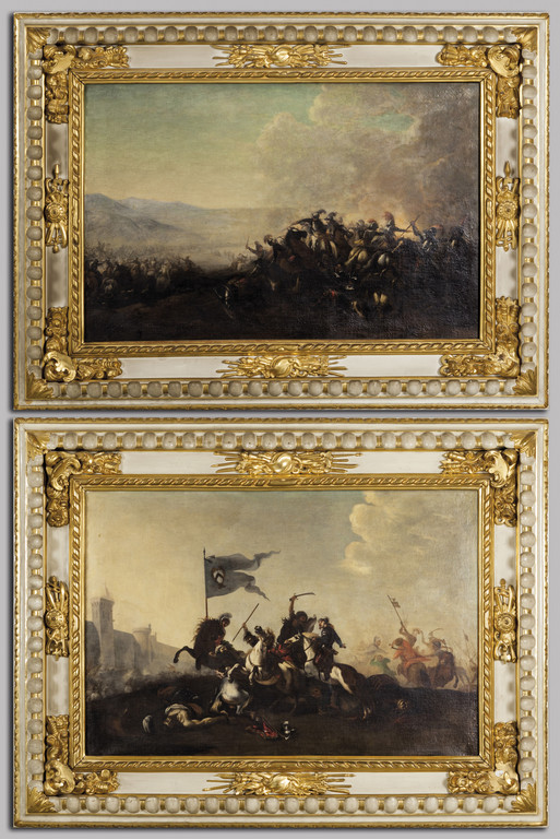 Questa coppia di 'Scene belliche' (dipinti a olio su tele cm 85 x 130) una imperniata su un acceso scontro all'arma bianca tra cavallerie cristiana e turca e l'altra rappresentante una più fitta battaglia tra cavallerie europee in cui emerge sulla destra un gruppo di cavalieri che tutti protetti da elmi e corazze si affrontano con le spade sguainate o a colpi di pistola. L'analisi stilistica e pittorica della prima in particolare delle figure principali in cui si distinguono un porta bandiera issante un grande drappo biforcuto con stemma un cavaliere dal viso aguzzo inquadrato di profilo su un destriero bianco affrontato da un saraceno con scimitarra levata permette grazie alla peculiare e assai caratterizzata tipologia delle suddette figure d'individuare il suo autore in un 'battaglista' ancora piuttosto raro da incontrarsi dello stretto ambito emiliano rappresentato principalmente da F. Monti detto il Brescianino e da I. Mercanti detto lo Spolverini.