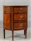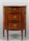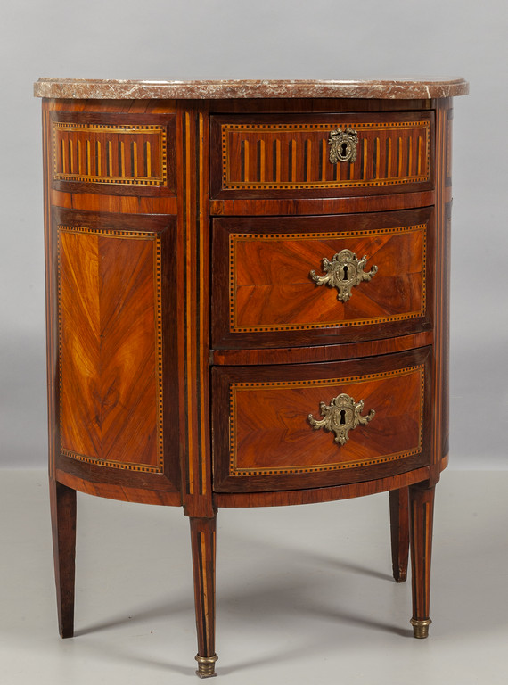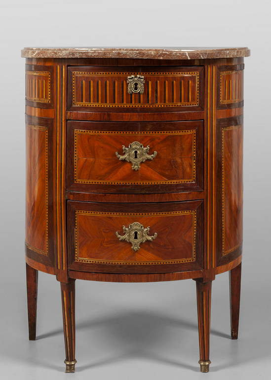 Piccolo comò Luigi XVI a demilune due cassetti grandi ed uno piccolo lastronato ed intarsiato in legni vari Francia fine sec.XVIII