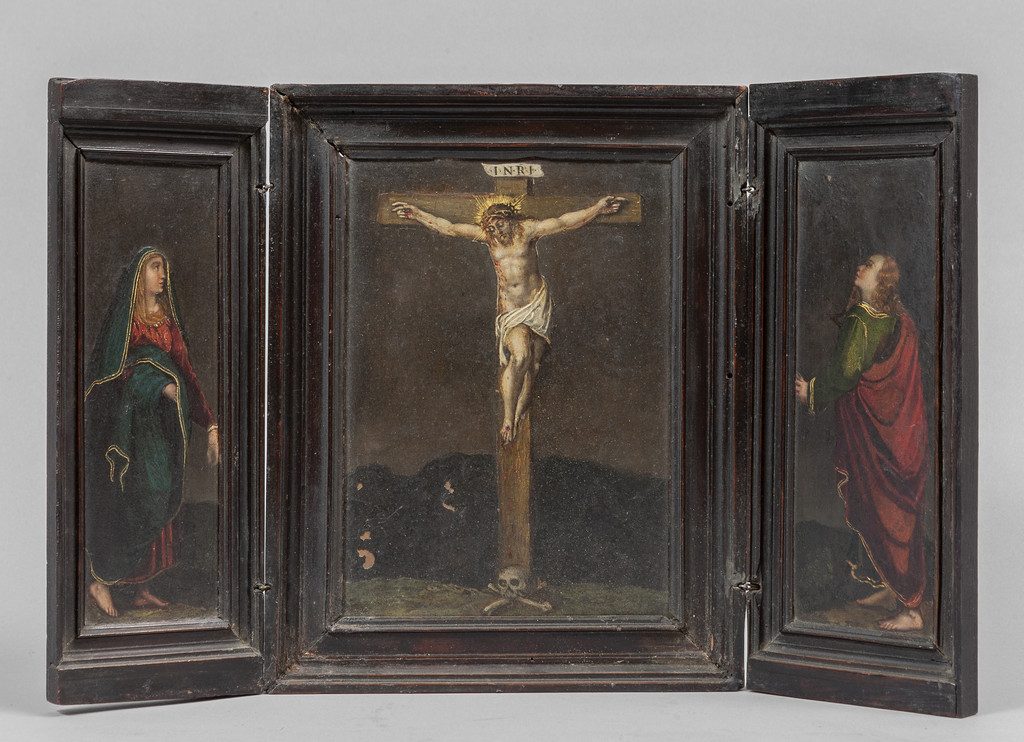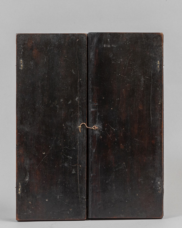 Altarolo da viaggio in legno ebanizzato con all'interno tre dipinti su rame arte fiamminga fine sec.XVII