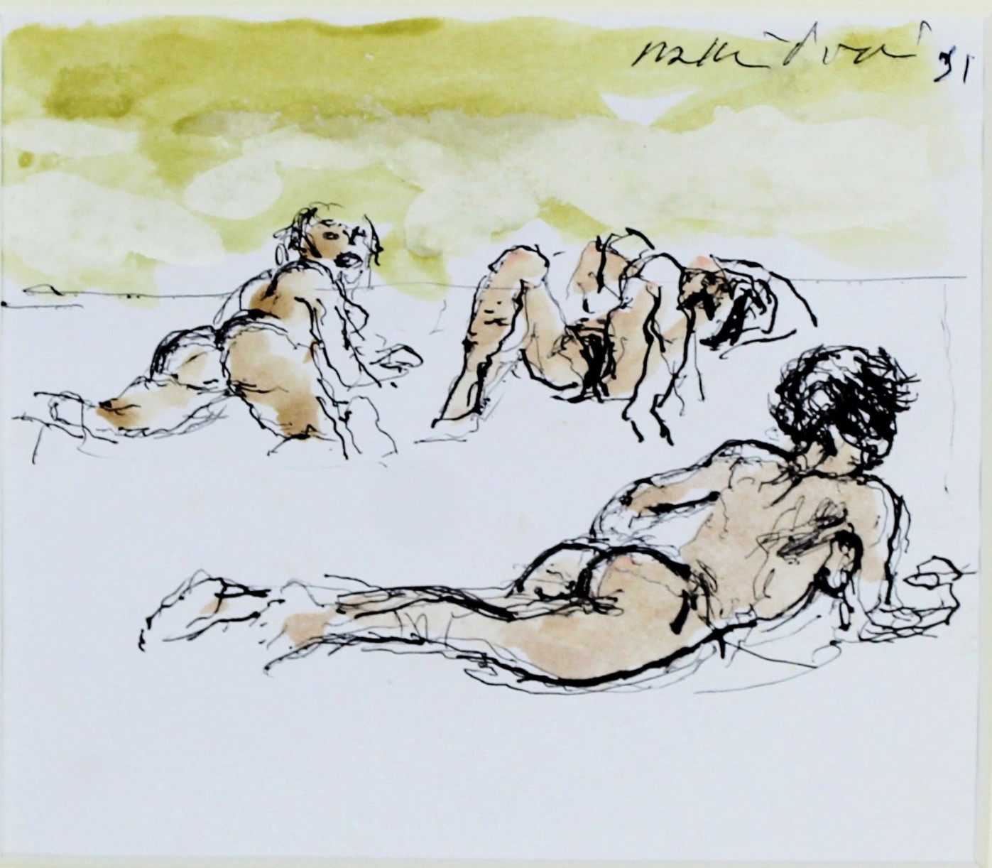 PIACESI WALTER Ascoli Piceno 1920 “Bagnanti” china e acquerello su carta cm 18x17 del 1991. Firmato e datato sul fronte in alto a sinistra. Autentica su foto.