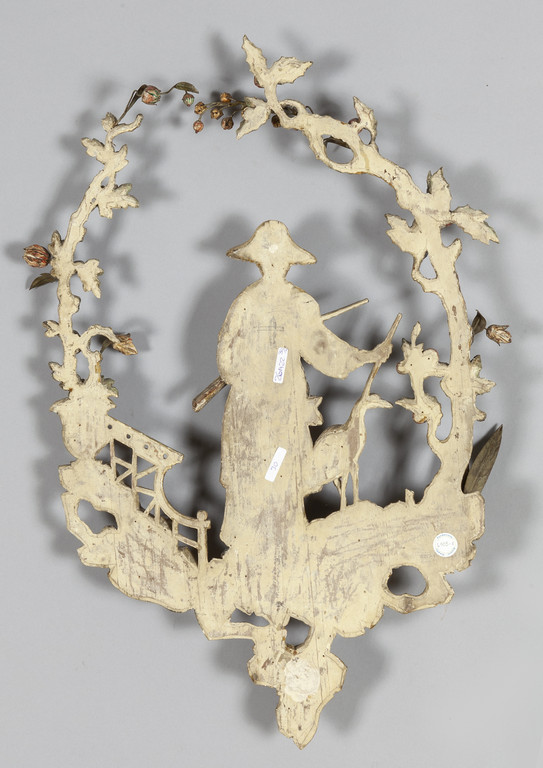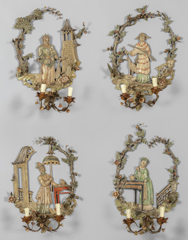 Quattro ventole a due fiamme in legno finemente intagliato e laccato con figure di cinesini e decorazioni in ferro policromo Piemonte inizi sec.XX