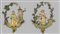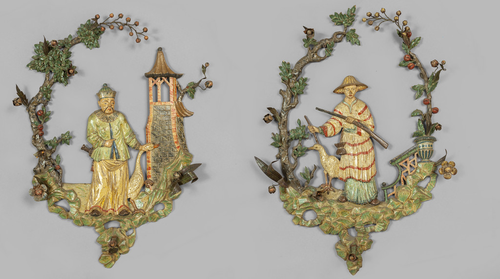 Coppia di apliques in legno intagliato e laccato con cinesini bracci in ferro policromo Piemonte sec.XIX