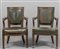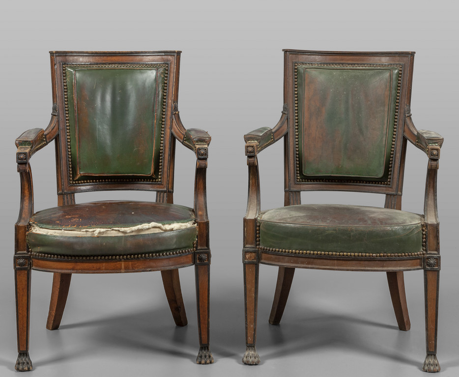 Coppia di poltrone neoclassiche in legno con profili ebanizzati ricoperte in pelle verde I metà sec.XIX (difetti alla pelle)
