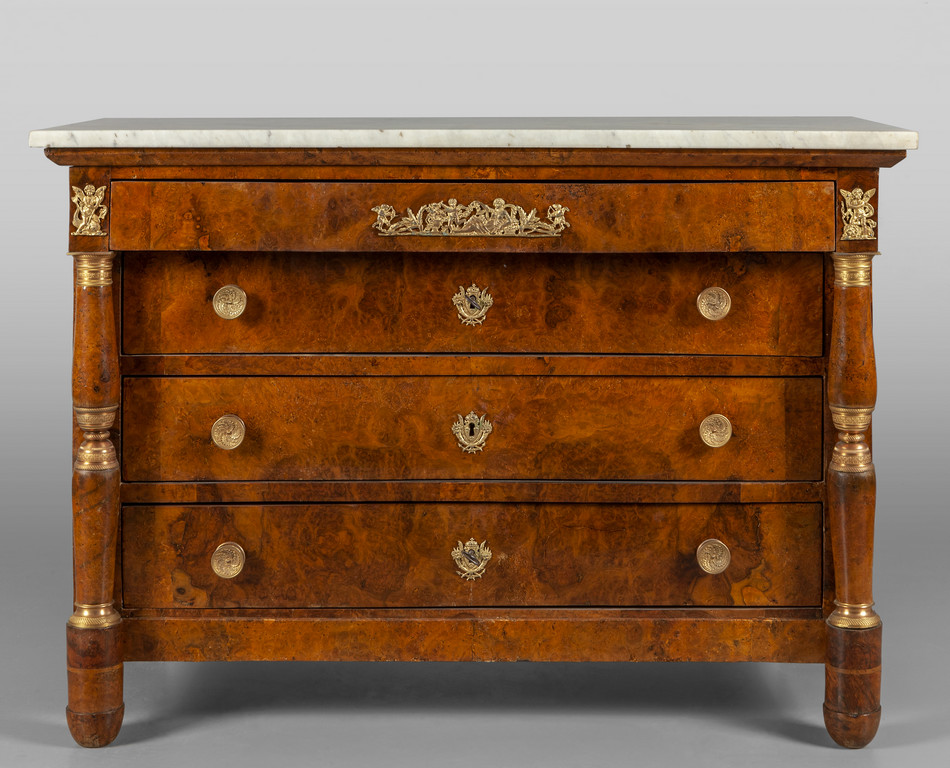 Comò Impero a tre cassetti grandi più uno lastronato in radica ricca decorazione in bronzo dorato piano in marmo Francia inizi sec.XIX