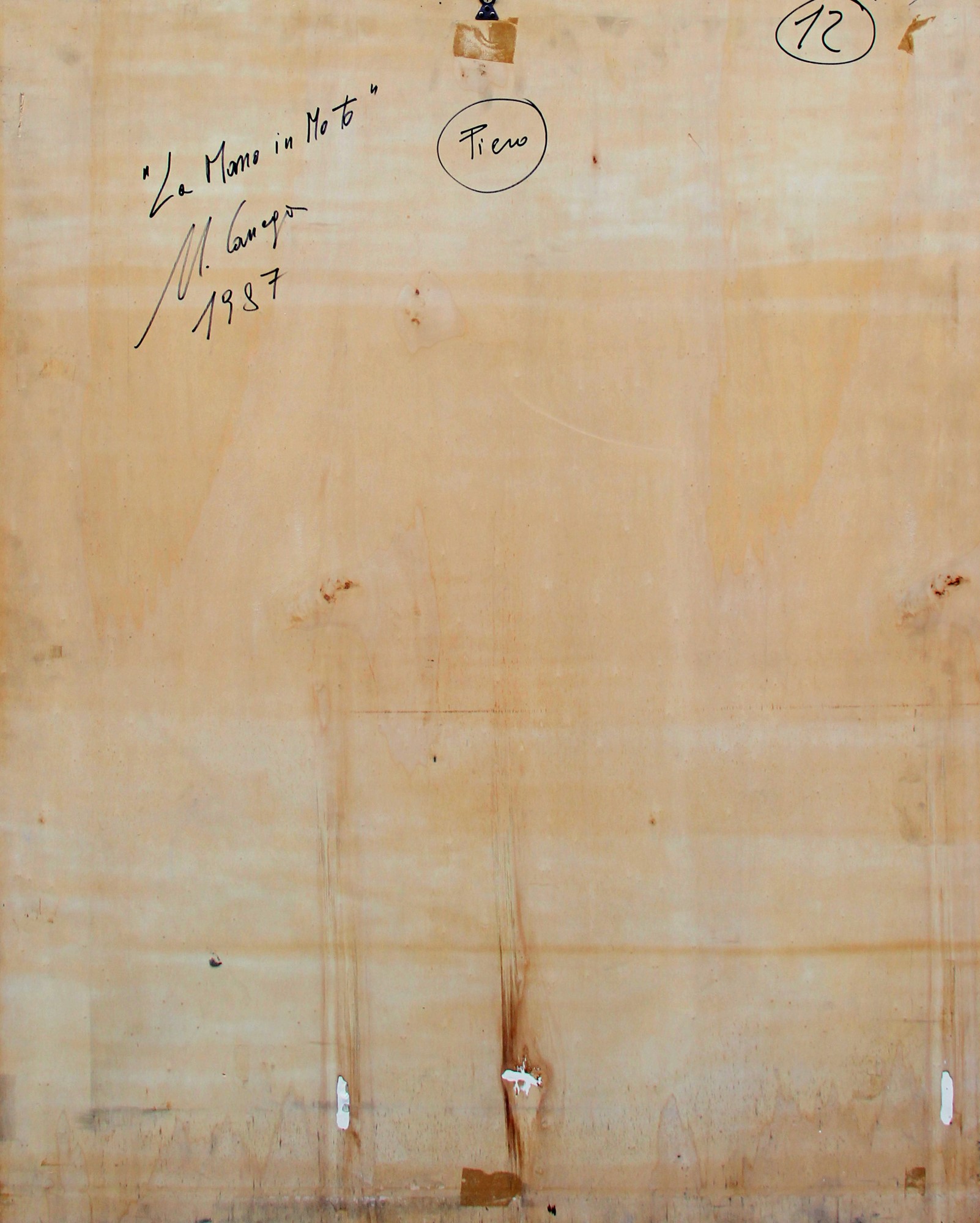 CARREGA, Ugo, La mano in moto, 1987, tecnica mista su tela applicata su tavola, cm. 111x91