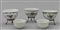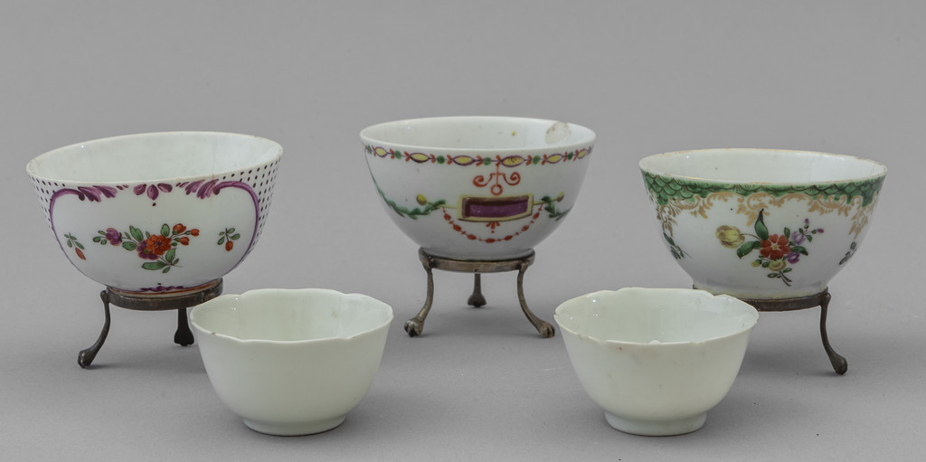 Tre tazzine in porcellana decorata in policromia a fiori marca Ancora Rossa e due piccole tazzine in bianco di Cina