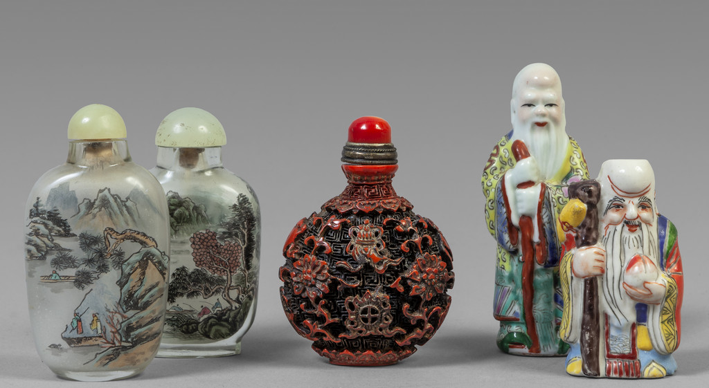 Cinque snuff bottles in porcellana lacca e vetro inizi sec.XX