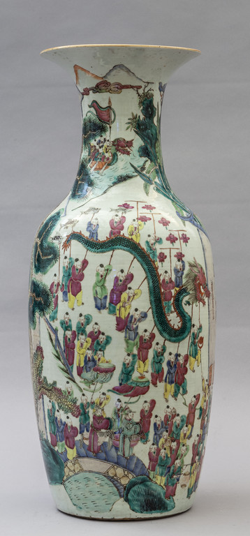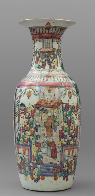 Vaso in porcellana policroma famiglia verde raffigurante scena di vita di corte con molti personaggi Cina sec.XIX