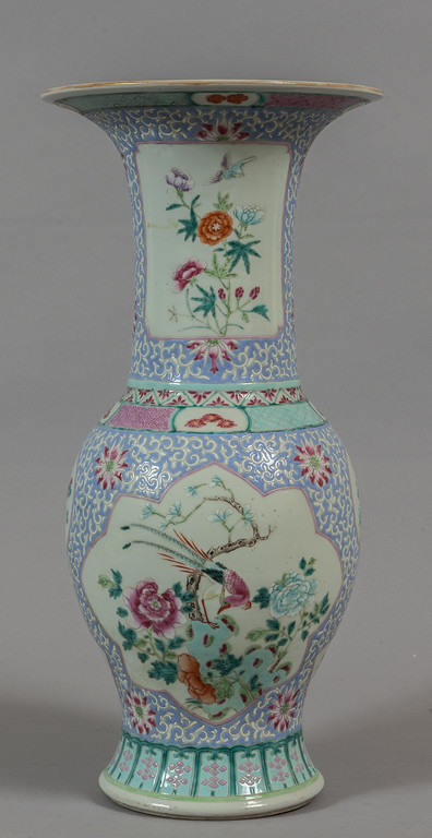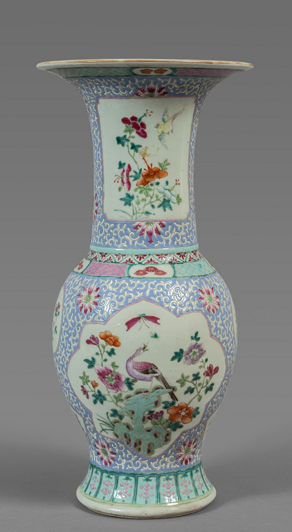 Vaso a tromba in porcellana decorato con pavone e farfalle entro riserve a fondo azzurro sec.XIX