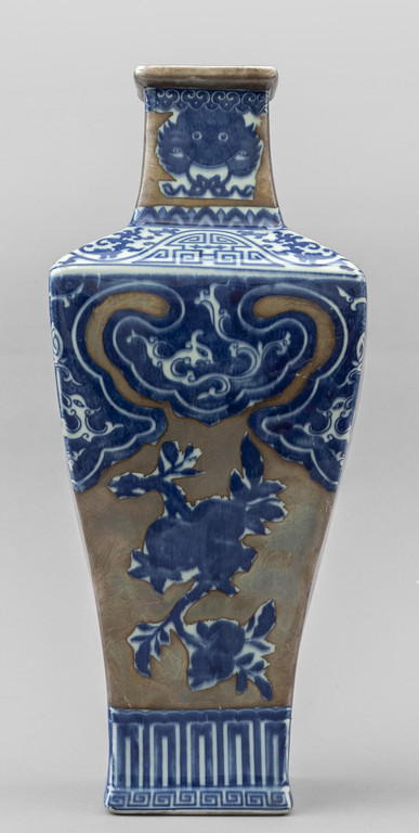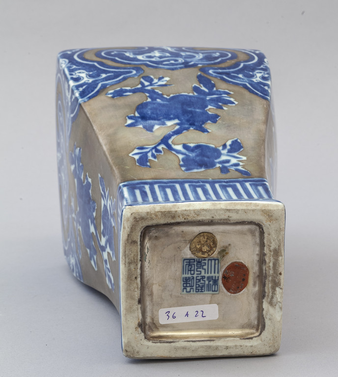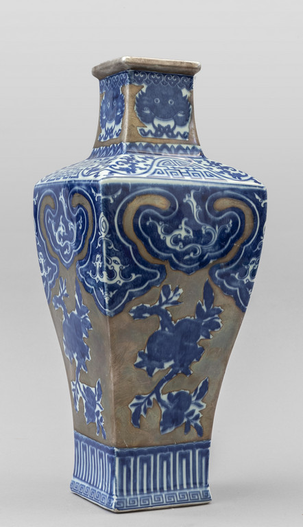 Vaso in porcellana di forma quadrata decorazione bianca e blu con dorature marcato sul fondo Cina sec.XX