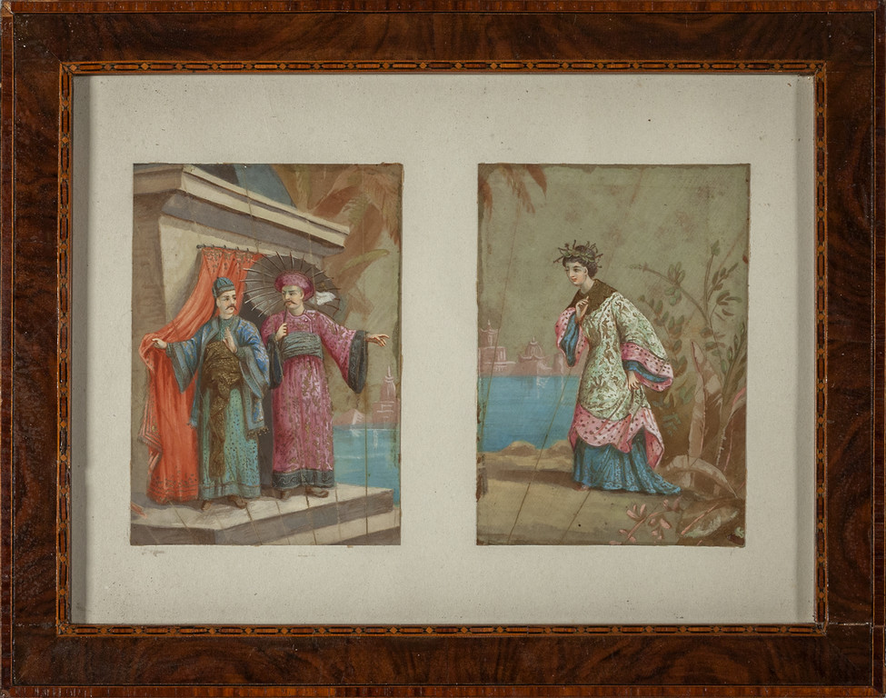 'Figure cinesi' due dipinti su seta in un'unica cornice sec.XIX