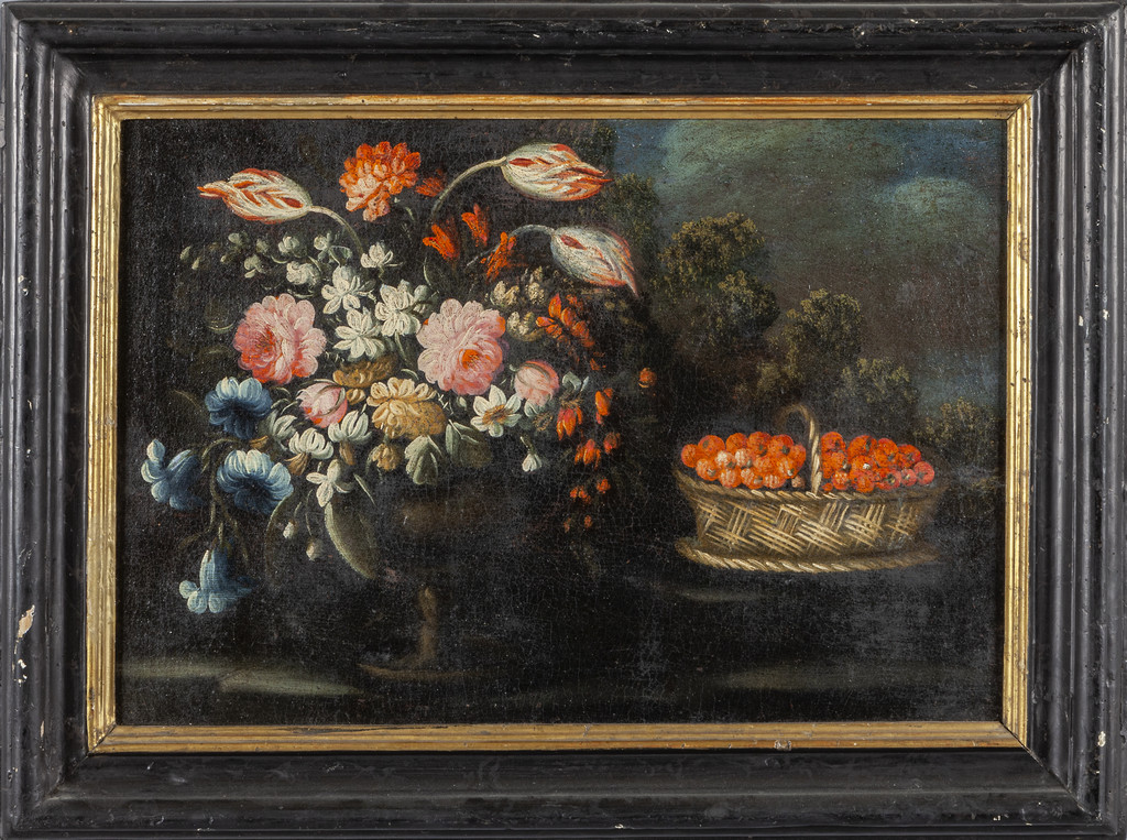 Scuola piemontese sec.XVII 'Nature morte con fiori e frutta' coppia di olii