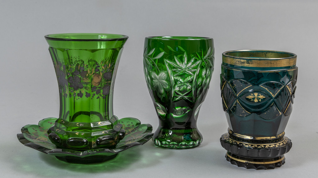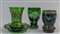 Due bicchieri ed un bicchiere con piattino in vetro verde inciso