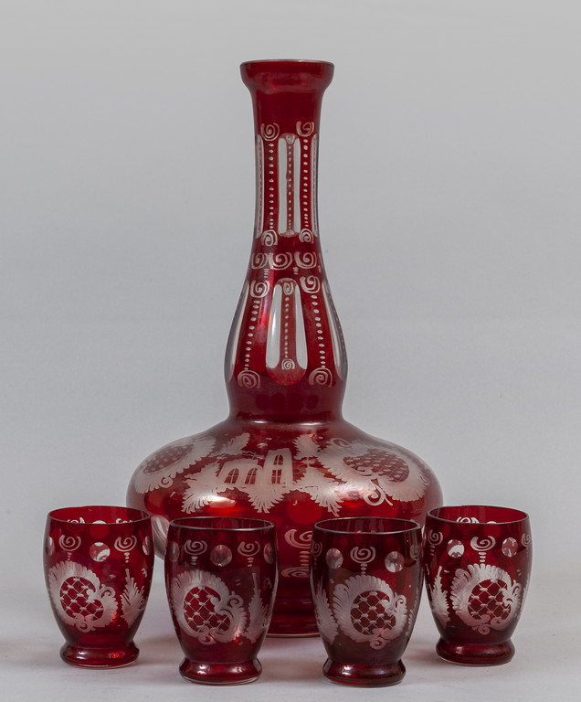 Bottiglia e quattro bicchierini in vetro di Boemia