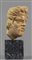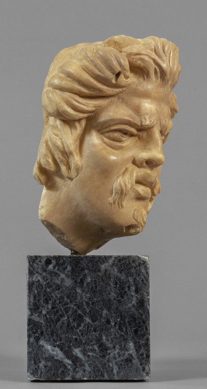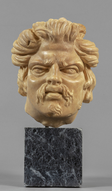 Testa virile con baffi scultura in marmo bianco poggiante su base in marmo verde