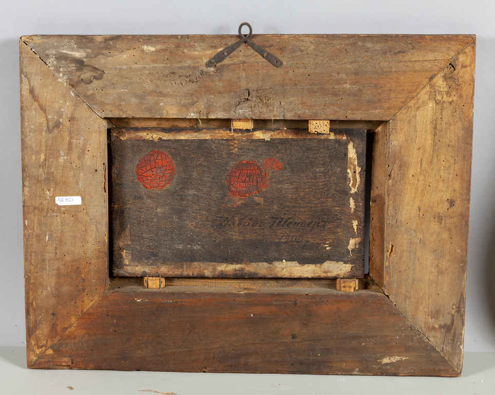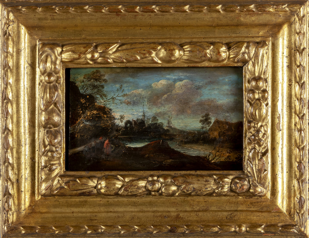 Scuola fiamminga sec. XVII 'Paesaggio animato' olio su tavola bella cornice Luigi XIV in legno intagliato e dorato