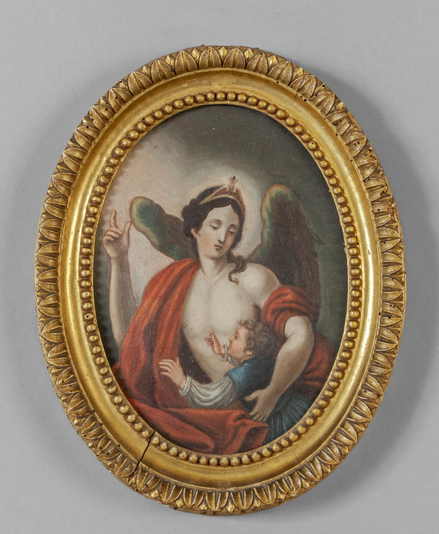 Scuola italiana sec.XVIII 'L'Angelo Custode' olio di forma ovale cornice coeva in legno intagliato e dorato