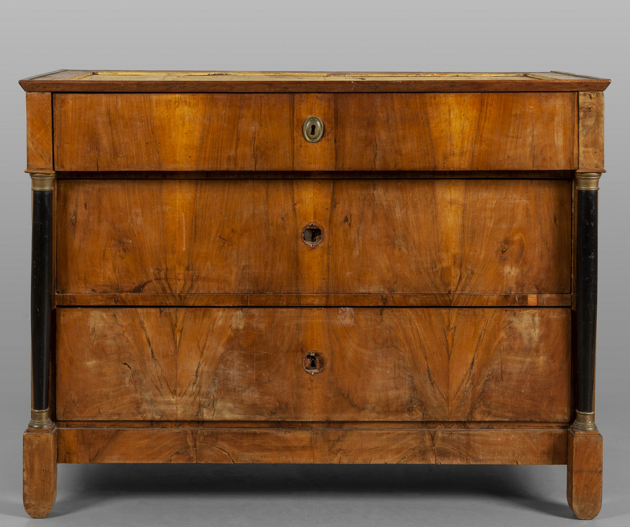 Comò Impero a tre cassetti con due colonne in legno ebanizzato lastronato in noce I metà sec.XIX