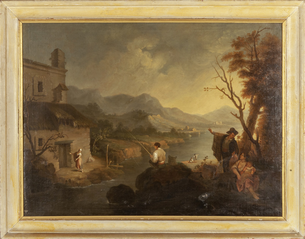 Scuola italiana inizi sec.XIX 'Paesaggio con pescatore' olio