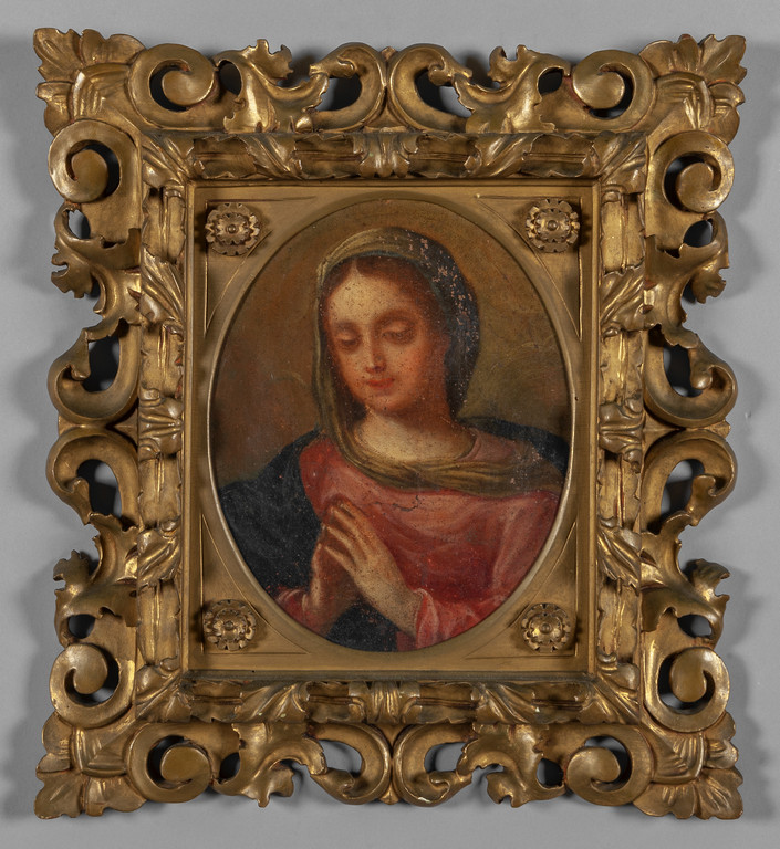 'Madonnina orante' olio di forma ovale sec.XVIII cornice in legno intagliato e dorato