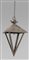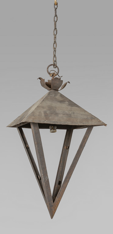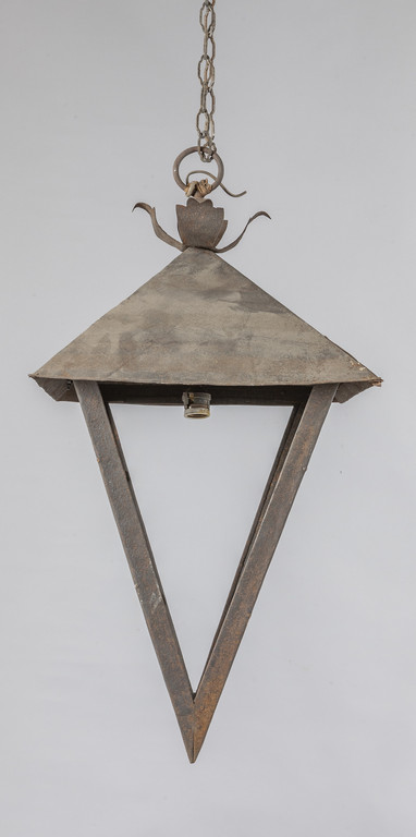 Curioso lampione da ingresso di forma triangolare in ferro battuto