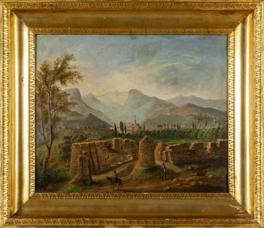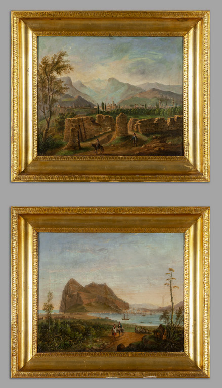 Scuola francese sec.XIX 'Paesaggi con figure' coppia di olii