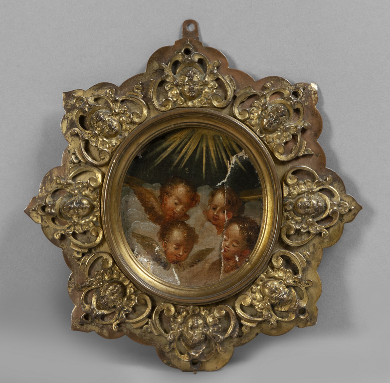 Cornice Luigi XIV in bronzo dorato con testine di angeli nel centro dipinto raffigurante quattro angioletti (strappato) sec.XVIII