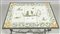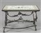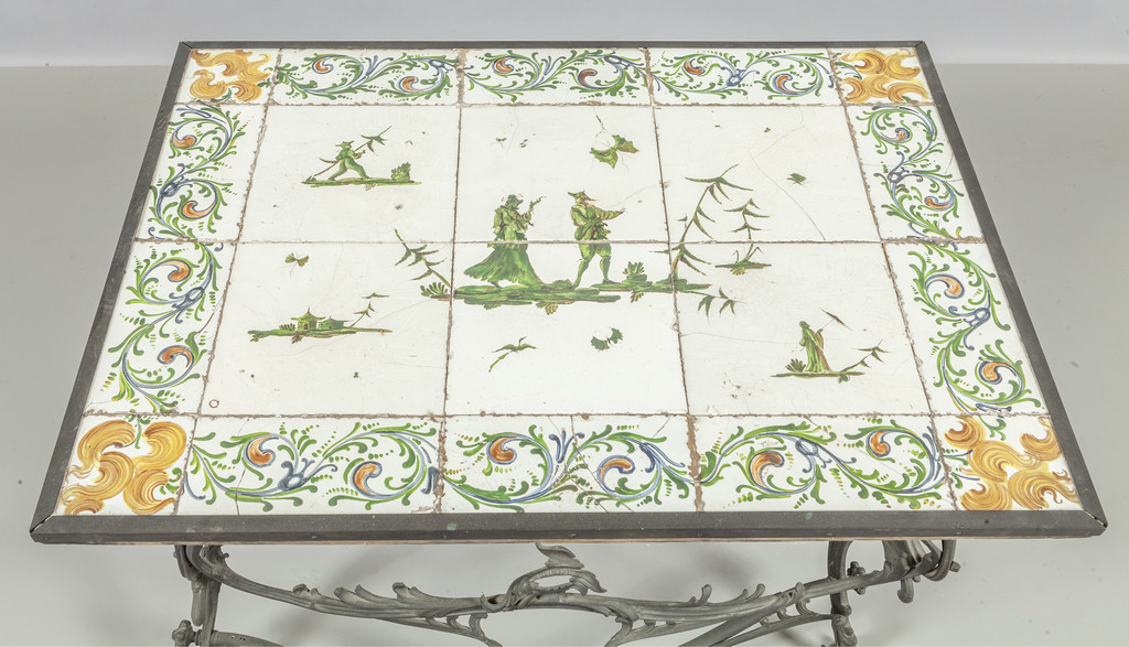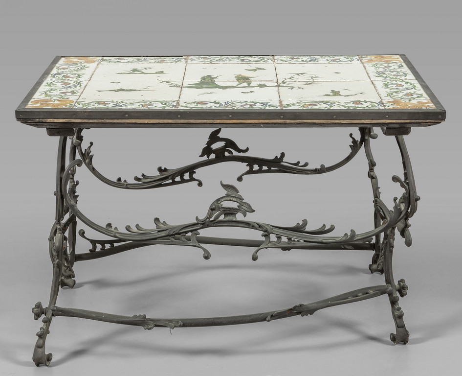 Tavolino basso da giardino base in ferro forgiato a motivi Liberty piano con piastrelle in ceramica decorato con scena centrale sec.XIX
