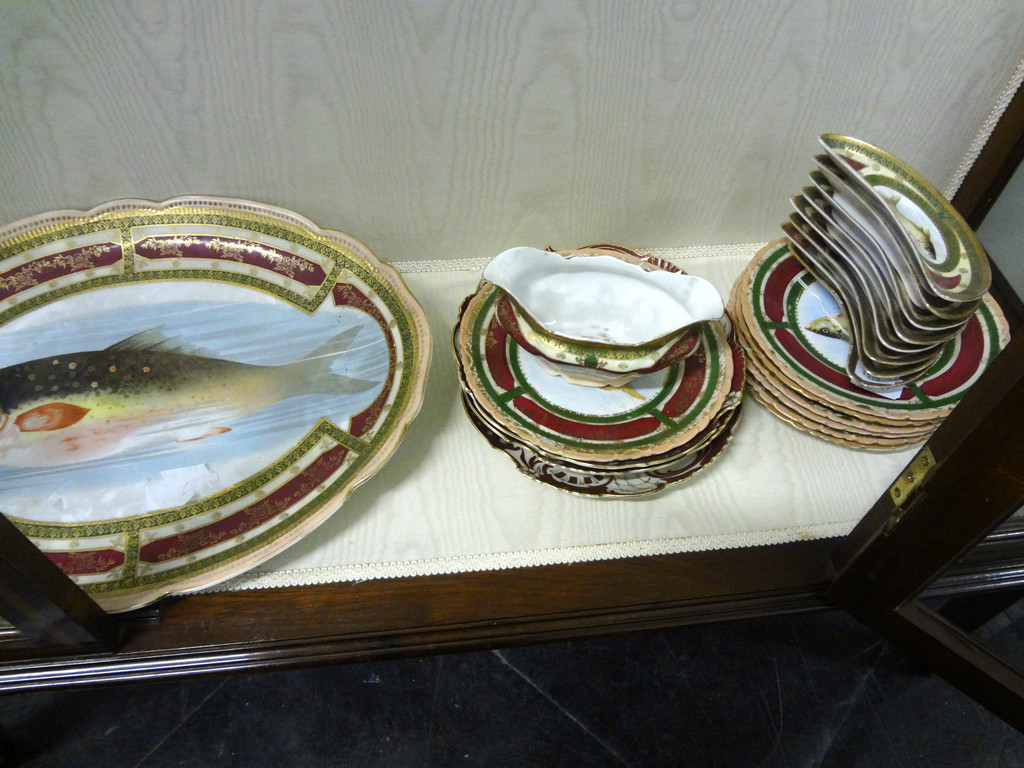 Servizio di piatti in porcellana decorata con pesci composto da 8 piattini 1 piatto da portata 8 mezze lune 1 salsiera e altri 6 piatti diversi Austria sec.XIX