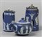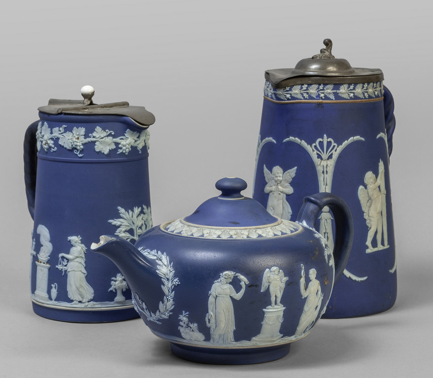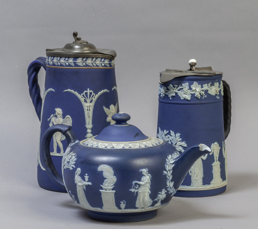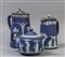 Theiera lattiera e cioccolatiera in ceramica Wedgewood bianca e blu con coperchi in peltro