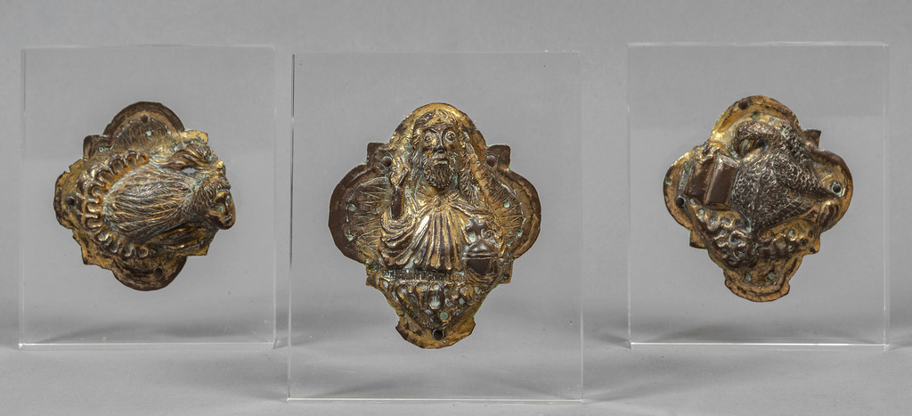 Tre canti in rame dorato Venezia sec.XVI montati su basette in perspex