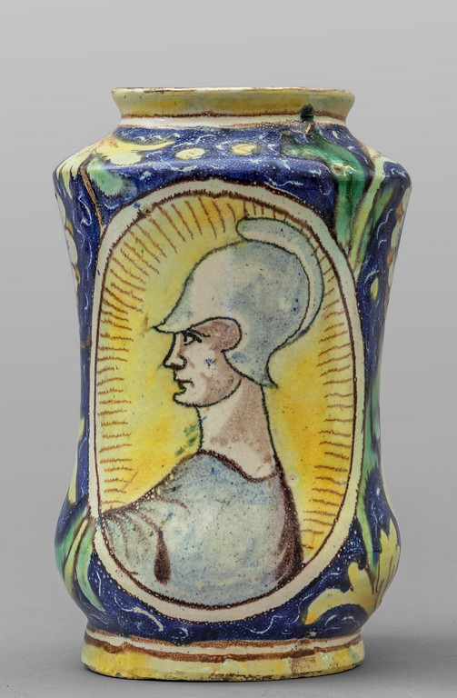 Albarello in ceramica decorato in policromia a doppio medaglione con teste di guerrieri Sicilia sec.XVIII