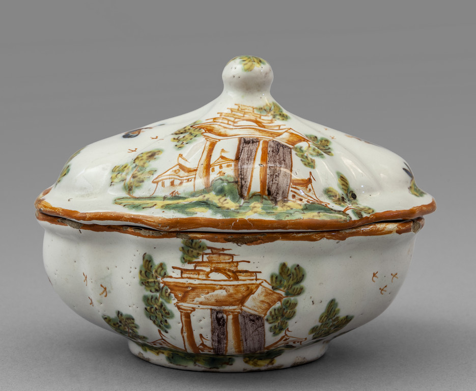 Zuccheriera Luigi XV in ceramica decorata a rovinismo su fondo bianco sec.XVIII