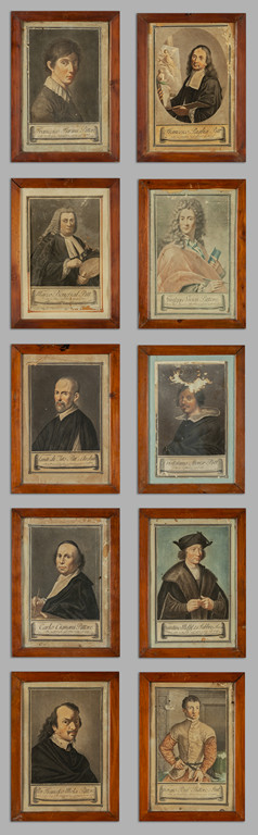 'Pittori famosi' dieci stampe acquarellate sec.XVIII