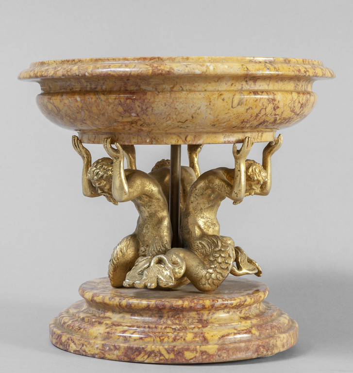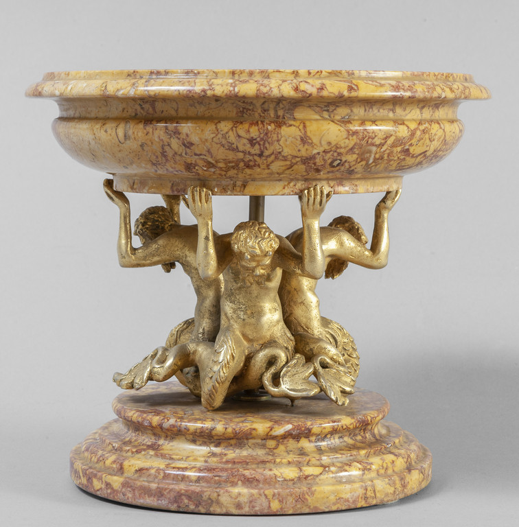 Alzata in broccatello di Spagna sorretta da tre tritoni in bronzo dorato