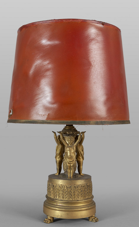 Elemento di centrotavola in bronzo dorato con tre putti adattato a lampada sec.XIX