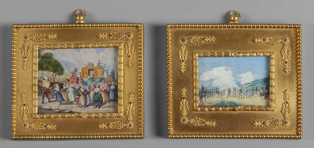 'Battaglia' e 'Festa' coppia di miniature cornici in bronzo dorato sec.XIX