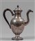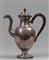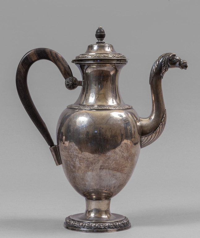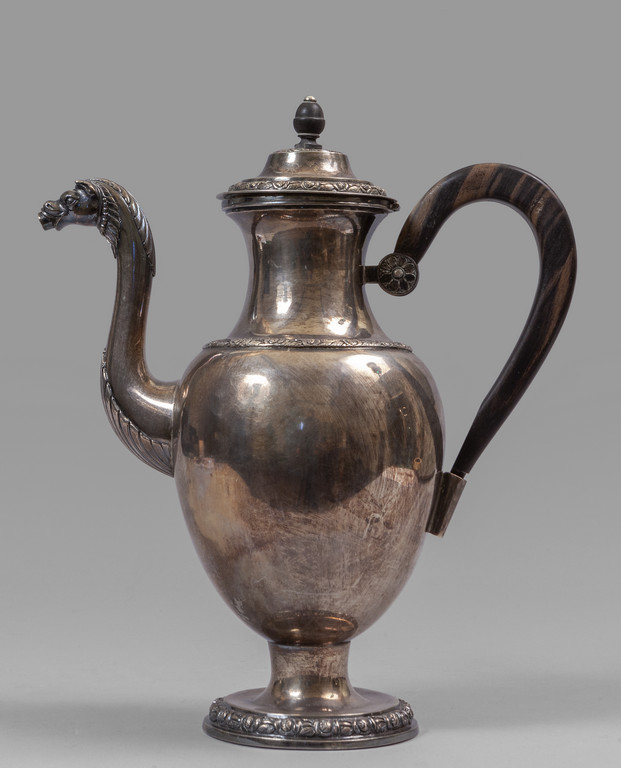 Caffettiera in argento finemente sbalzato beccuccio con testa di animale presa in legno ebanizzato inizi sec.XIX