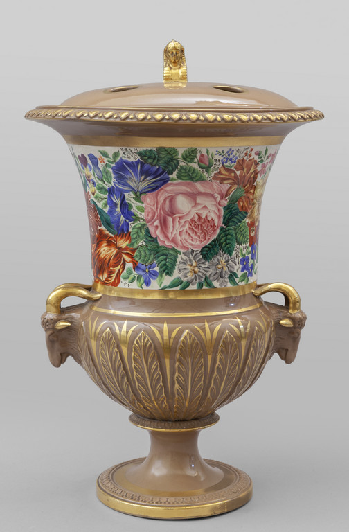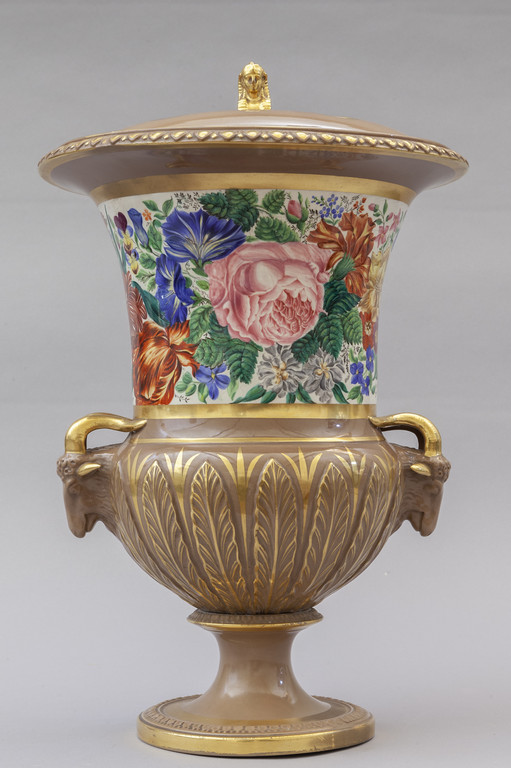 Grande tulipaniera in porcellana decorata in policromia e oro con fiori nella fascia
