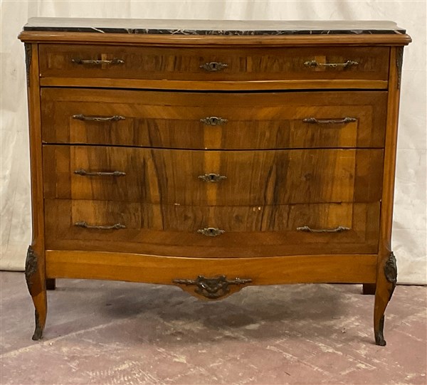 Cassettone in legno filettato di forma mossa, tre cassetti sotto uno a mezza lunghezza, piano in marmo incassato (cm 139x109x60) (difetti e rotture)