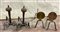 Due coppie di alari diverse in ferro battuto con guarnizioni in metallo dorato (difetti)