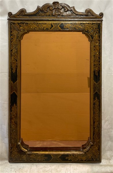 Specchiera in legno laccato a fondo nero riccamente decorata a fregi dorati, rami fioriti e foglie. Cimasa sagomata a volute e intagliata. (cm 107x64) (difetti)