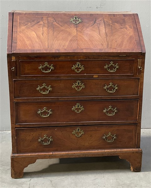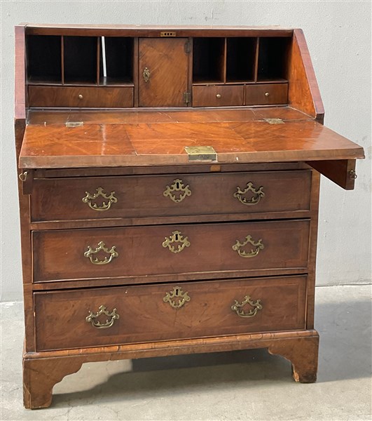 Ribalta lastronata e filettata, antina celante tre cassettini, uno sportello e vani a giorno, fronte a tre cassetti più uno piccolo sottopiano, tiretti laterali reggipiano. Piedi a mensola, Inghilterra secolo XIX (cm 78x97x45) (difetti, restauri e mancanze)