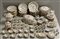 Servizio in porcellana policroma per dodici commensali, decorato a motivi naturalistici e piccoli oggetti di uso quotidiano. Composto da dodici piatti fondi e ventiquattro piani, tre insalatiere di cui due con tesa traforata, due zuppiere biansate e una zuppierina tonda, dodici piatti da antipasto e dodici da dessert, tre piatti da portata ovali e quattro raviere, due salini e due pepini, una salsiera, due mestoli e dodici cucchiai, dodici portauova con piattini. Dodici tazze da tè con piattini, teiera, lattiera e zuccheriera. Undici tazzine da caffè con piattini, caffettiera, lattiera e zuccheriera. Cina, Macao, seconda metà sec. XX (lievi difetti)
