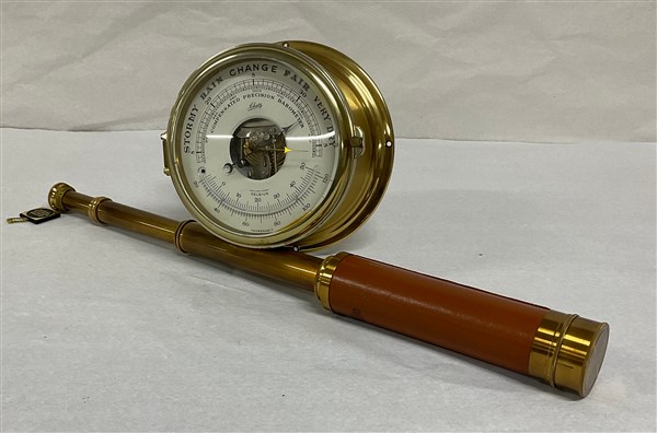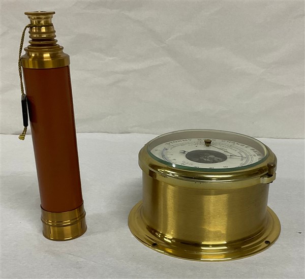 Lotto composto da un barometro navale Schatz di forma circolare in ottone (d. cm 18) e un cannocchiale di marca Hertel Reuse in ottone con impugnatura in pelle. Secolo XX (difetti)