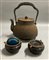 Lotto composto da una teiera in ferro e due posaceneri in smalto cloisonnè Mani